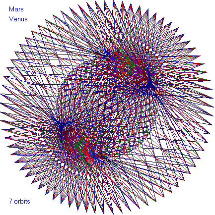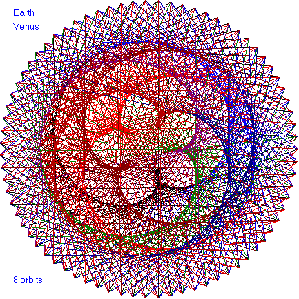 "The idea is really quite simple by treating each planet's orbit as a concentric circle whose radius is proportional to the planet's distance from the sun," explains Arrington. "The planets orbit the sun at different rates. For each incremental movement of the outer planet around the circumference, such as at a 5 degree interval, a straight line is then drawn to connect the 2 planets." On the first drawing of the Earth-Venus pair, the outer planet made 8 orbits around the sun. "You can see there are 8 vector lines into each of the incremental draw points around the circumference of the circle." With each orbit of the outer planet, a different color was used for the lines drawn. The pattern that emerges is unique and beautiful, "a function of the harmonic of the orbital speed differences of the two planets," writes Arrington. A link to more planetary dances and the code is below.