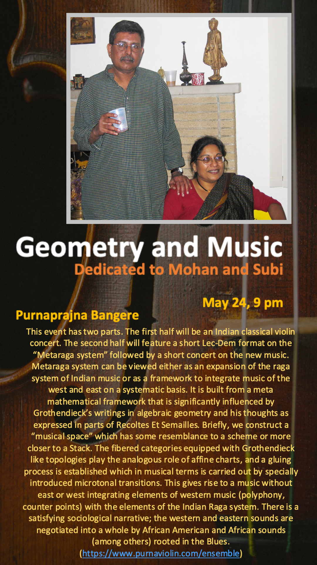 On Tuesday, after the conference, there will be a banquet at Brasserie by Niche (6pm-8:30pm; 4580 Laclede Ave., St. Louis), followed by a musical event at Mohan's house (''Geometry and Music'', performed by Purna, starting at 9pm). [Mohan's address: 7150 Waterman Ave., University City]